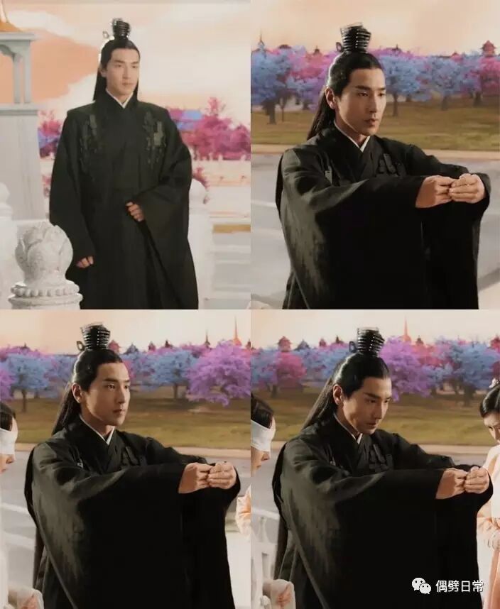 站立的时候,也站得宝相庄严的,一只手前屈。而行礼的姿势,我认为也是剧中人物做的最到位的一个,每一个礼行的有张有弛,眼神也有虚实变化的处理,在更正式的场合,他会把这个行礼的姿势分解成更多的步骤来完成,加入一些推手的动作,和表情,以满足情景的需求,唔,很是有着我们天族的气度,甚好,甚完美。