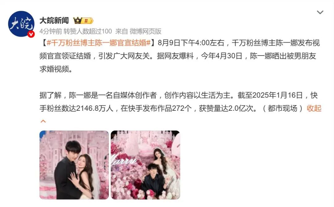 8月9日下午,千万粉丝网红陈一娜在社交平台晒出结婚证,正式官宣领证,瞬间引爆热搜。从4月求婚到7月公布婚期,再到8月领证,短短四个月完成人生重要节点,网友直呼“这效率,不愧网红!”