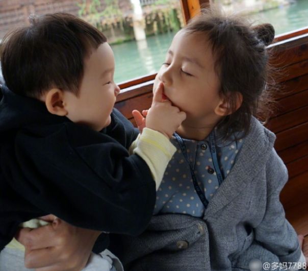 照片里,多妹跟多弟面对面坐在一起,感觉很是亲昵。多弟的脸跟手都胖嘟嘟的,看起来很是可爱。