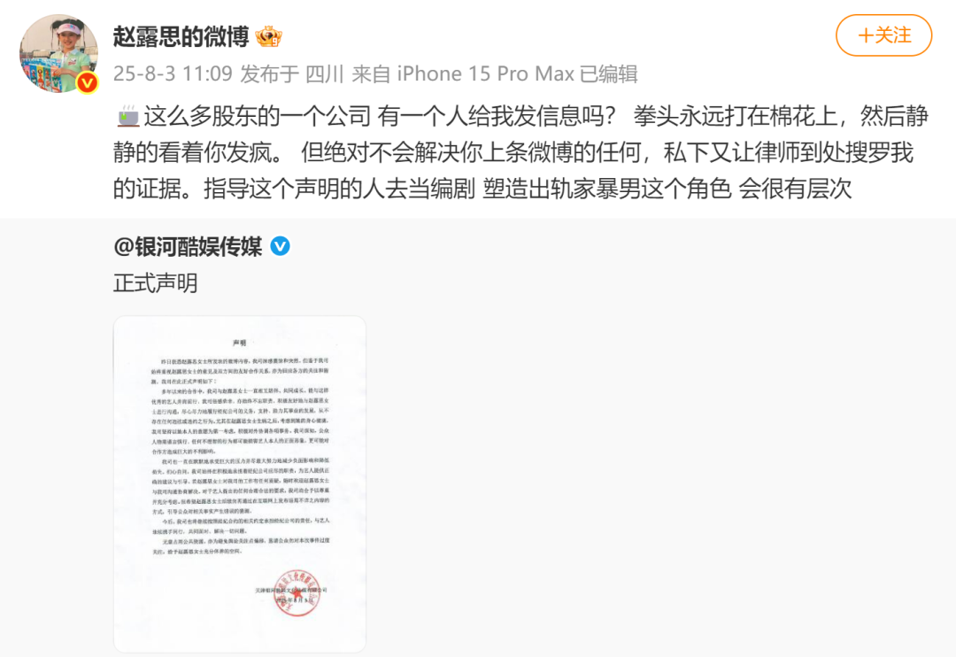 8月2日,赵露思发长文控诉经纪公司银河酷娱传媒,称其从工作室划走205万,等到现在也没有等来任何沟通,“我内核超烂,也不体面,但不用你们封杀我 ,我不干了。”