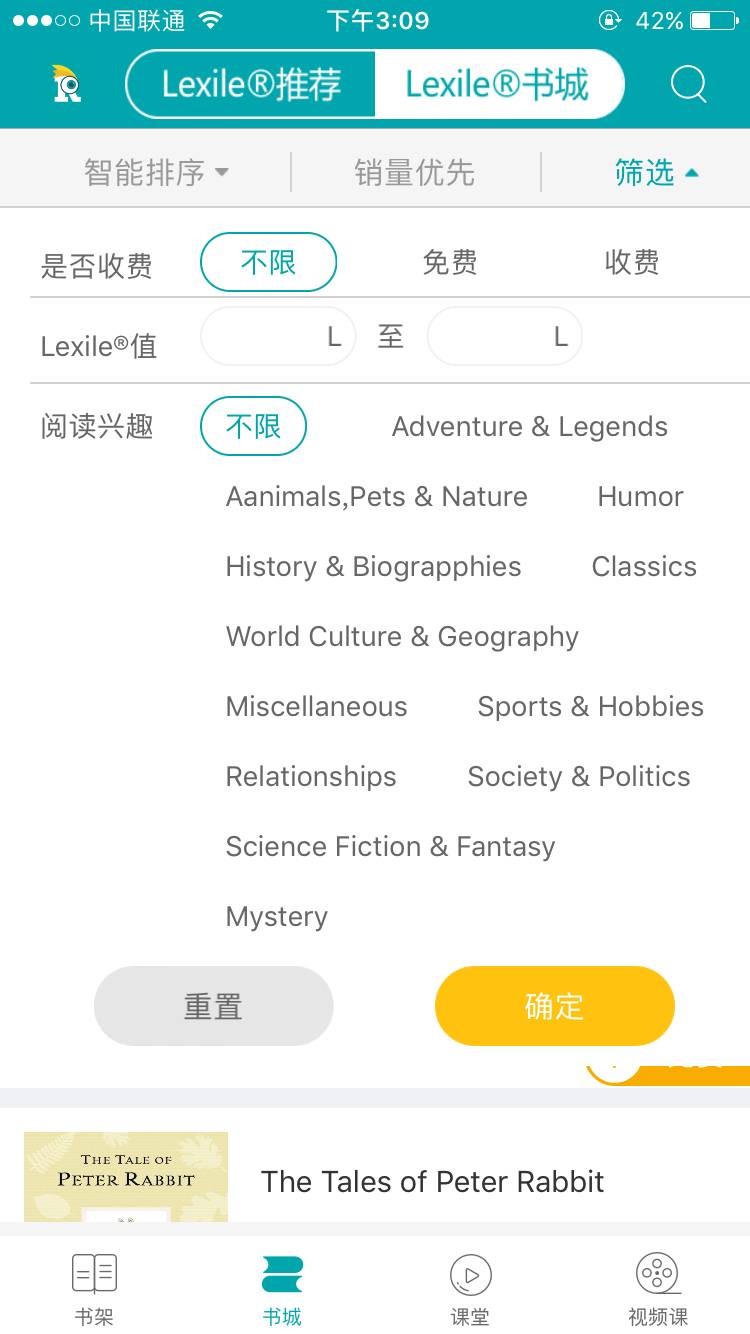 在挑选读物时,我们可以利用“Lexile书城”中的“筛选”功能帮助挑选出真正适合和喜欢的书籍,筛选功能从是否收费、蓝思指数和兴趣爱好三个方面来帮助用户选择书籍。详见下图: