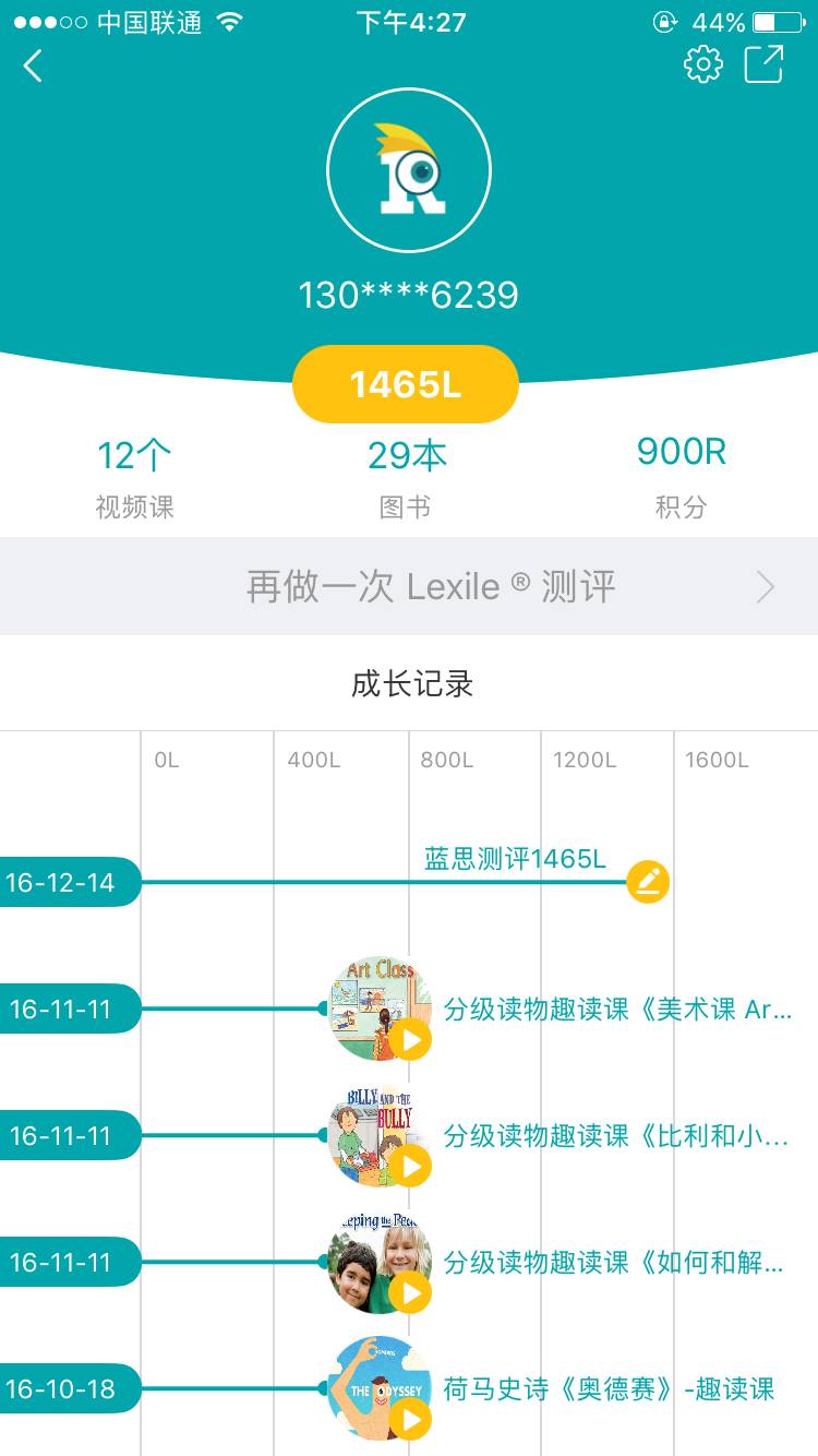 ReadingPro平台上的蓝思测试周期为2个月,即上一次测试结束2个月后可以进行下一次测试。经过持续的阅读和定期的蓝思测试,ReadingPro平台上会为每一名用户生成成长记录,记录用户每一次的进步和成长、读过的书籍和学过的视频课,见下图: