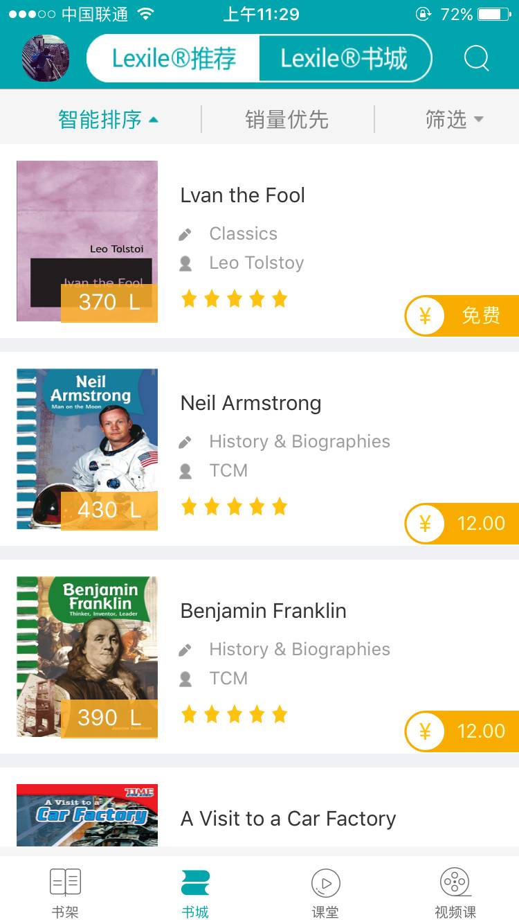 书城顶部分为两栏,其中“Lexile推荐”是根据用户蓝思指数推荐的难度适宜的读物,“Lexile书城”是ReadingPro平台上的全部书籍,包括免费公版书以及所有分级读物。