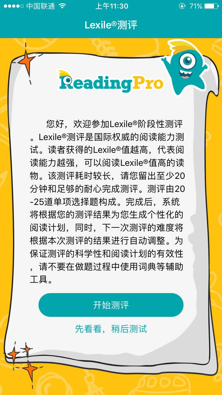 ReadingPro引进了美国MetaMetrics公司(Lexile母公司)研发的蓝思阅读测评体系,用户可以在ReadingPro平台进行免费(现阶段免费)的蓝思测试,对自己的英文阅读能力进行准确评估。