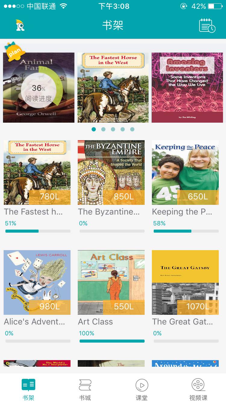 我们购买过的所有书籍都会存储在“我的书架”中,方便用户随时阅读。每本书下方都有绿色进度条,提示用户阅读了多少、还剩多少,一目了然。