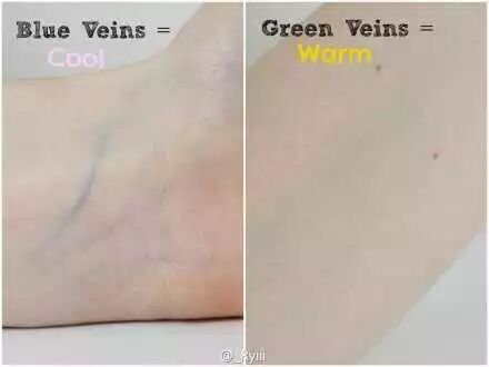 有很多宝宝一直搞不清自己到底是冷皮还是暖皮,对着光观察手腕处血管的颜色,如果是偏冷的蓝色血管就是冷色系皮肤,如果是绿色血管就是偏暖色皮肤,如果紫色绿色都有就是大家常说的中性皮。