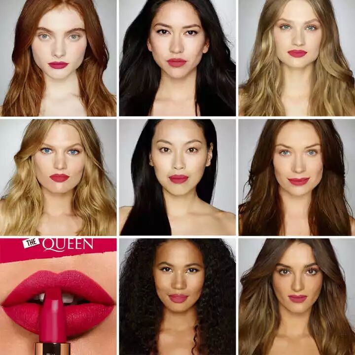 如果还不明白就再来一个例子,下图是各种肤色的浆果色口红试色,是一个饱和度高也不太会挑皮的颜色,不管冷皮暖皮肤色是否白皙涂起来都会好看。可以很明显的看到皮肤越白口红的颜色在脸上的色彩感越强,也越抬气色。