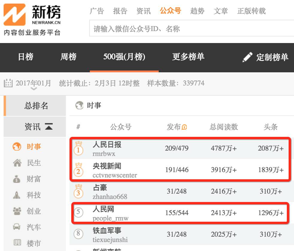 但激烈的市场竞争,在一些场合下已经表现很明显了。比如人民日报和央视新闻,长期占据新榜阅读量排行榜的前两位。而新华社旗下的几个新媒体账号却发展乏力。