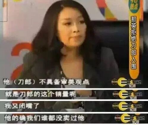 2010年,那英去给一个音乐盛典当评委,为了阻止歌手刀郎入围,她一票否决,理由是:刀郎的歌不具备审美观点,只有农民才会在KTV里唱刀郎的歌。