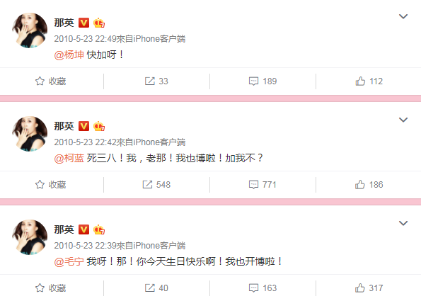她@毛宁:我呀!那!字里行间亲切地像是用转盘式按键座机在通话。她@柯蓝,一上来就喊:死三八。我的妈,在遥远的2010年,那英就能发语音了?她@杨坤:快加呀!哈哈哈哈哈哈我仿佛看见了自己当年的QQ空间。