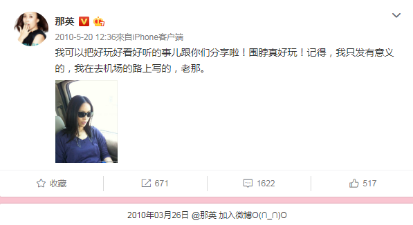 微博上显示,那英是2010年3月26日这天正式拥有了自己独立账号的微博。但那英真正发布的第一条动态,是在2010年5月20号。