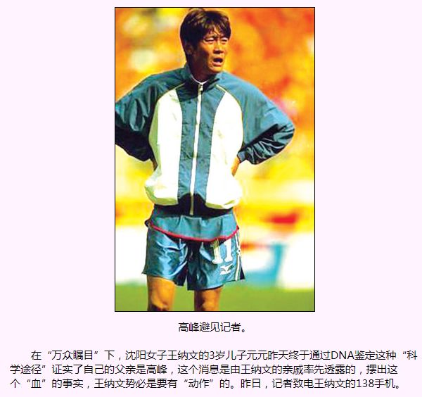 高峰当然不认这个帐。王纳文也不好惹,闹到法院,出了亲子鉴定:叮,父子卡。高峰不认也不行。