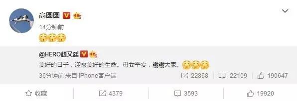 5月21日下午,赵又廷亲自发博,宣布:“美好的日子,迎来美好的生命。母女平安,谢谢大家。”最后加了三个鼓掌的表情。一如既往的官宣方式,却是难掩的喜悦激动之情。随后高圆圆转发,同样也是三个鼓掌的表情。