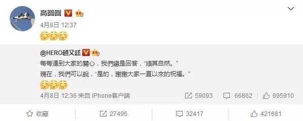 终于在4月8日,赵又廷和高圆圆官宣:每每遇到大家的关心,我们总是回答,“顺其自然。”现在,我们可以说,“是的,谢谢大家一直以来的祝福。”分享了高圆圆怀孕的好消息,一时间祝福声不断。