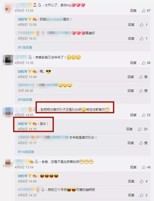 在赵父的微博下,大家也都是恭喜声,还有网友问他是喜欢孙子还是孙女,赵父回答是“孙女”,于是大家猜测高圆圆怀的是女孩,没想到还真的是,原来赵父一早就透露了宝宝的性别,网友们也是很厉害!