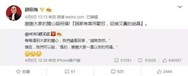 而就在赵又廷和高圆圆官宣怀孕这天,赵又廷的父亲赵树海也转发了儿子的微博,“谢谢大家的关心与祝福,宅赵家有喜同欢欣,迎接又圆的结晶”,也是非常有文采了。