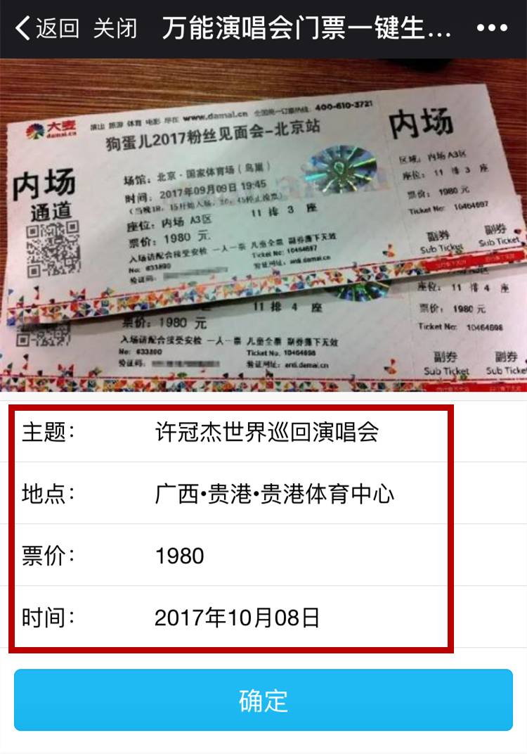 看到门票了,就以为是真的?其实此次虚假信息出处为网络微信小程序-万能演唱会门票一键生成器,它可以自定义演出的明星、场馆、日期和票价等内容!