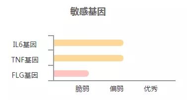给大家介绍一下:FLG基因可以产生天然保湿因子,如果它能力差,产生的天然保湿因子数量就少,会使皮肤保水能力变差,抵抗力降低,皮肤就容易敏感。只有重点扶植短板,才能真正让自己的皮肤问题有所改善。