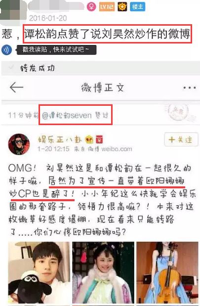 而谭松韵点赞的微博是:刘昊然居然为了宣传一直带着欧阳娜娜炒CP,也是醉了。