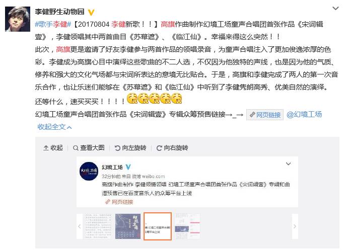 之前在湖南卫视的书香中国,李健就曾公开表示:正在做把古典优美诗词与现代音乐相结合这件事,果然不负众望,如今李健兑现了承诺,和高旗带来了这张绝美的宋词专辑,当然《苏幕遮·碧云天》还只是其中一首,后续还会有《临江仙》、《江城子》等相继问世。