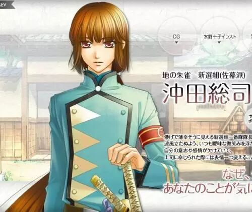 冲田总司(1842年7月8日——1868年7月19日)本名冲田宗次郎藤原春政、1863去京都前改名冲田总司藤原房良,是江户时代后期,幕末的新选组队士、副长助勤、一番队队长、剑术指导,因肺结核卒于江户。