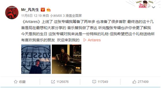 11月6日是吴亦凡的28岁生日,这一天他推出了筹备两年多的新专辑,作为自己的生日礼物。