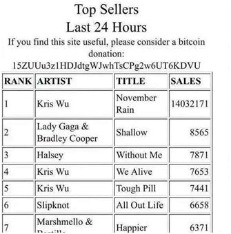 24小时内,ITunes上吴亦凡的专辑销量,是位于第二的Lady Gaga的1638倍,同样发了专辑的A姐、皇后乐队就更惨,连榜都没上。