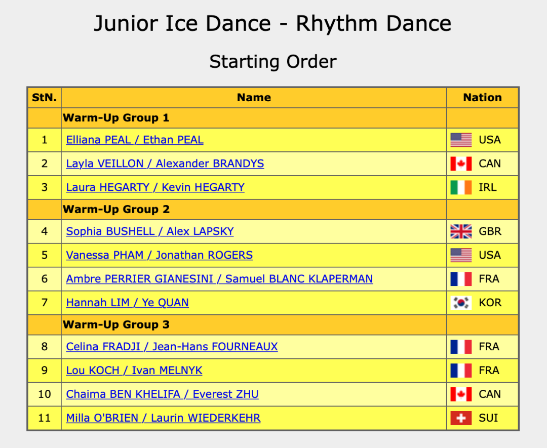 冰舞方面,本站最为人所知的是韩国组合林汉娜/权晔,他们是世青赛第6名,去年表演的《江南Style》给人留下了深刻印象;美国组合Eliliana Peal / Ethan Peal和Vanessa Pham / Jonathan Rogers分别是全美青年组的第3和第4名;法国组合Celina Fradji / Jean-Hans Fourneaux是2022年世青赛的第9名。