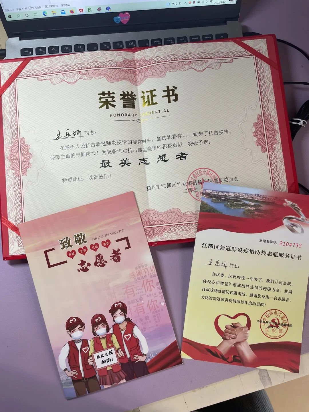 在平时的学习生活中,王乐妍与同学、室友相处融洽,并积极帮助在学习上有困难的同学。她能合理安排个人的学习、休息、娱乐时间,使生活合理有序的进行。同时,她还合理利用寒暑假做兼职,由此来锻炼自己,与时代接轨才能更好的融入社会。此外,疫情期间,她主动参加了社区疫情防控的志愿者活动,为国家社会奉献自己的一份力量。