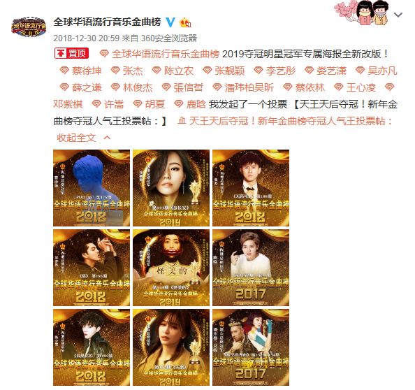 也有人顺手po出了现在一些比较热门的音乐榜单,估计郑钧老师吐槽的也就是这种怪现状了,就好比这种年度金曲榜让大家投票评选并不是歌,而是人。