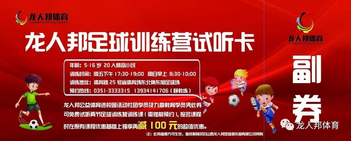 即日起,太原九章教育的所有学员可以免费预约试听龙人邦足球训练营兴趣训练课程两课时,并且报名龙人邦足球训练营课程立减100元;龙人邦公益体育进校园活动的社团学员及足球训练营学员可免费预约试听九章教育语文/数学/英语/课程各一节,并且报名九章教育课外辅导课程立减100元!