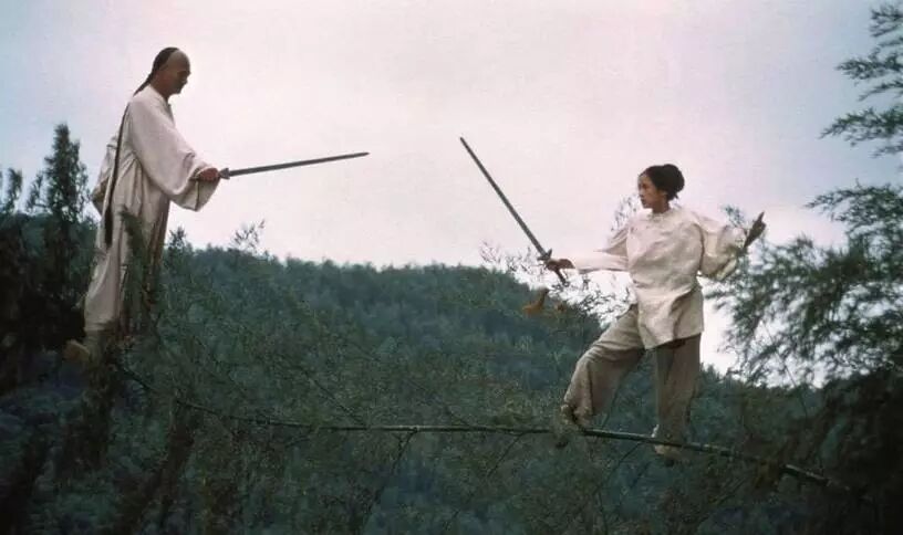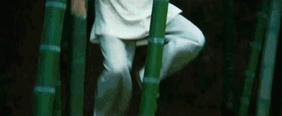 最著名的竹林打斗,章子怡要实打实站在竹稍上,模仿竹子清盈飞飘的动作,没有特效,就是每天吊在钢丝上,整整两个星期都没下地。