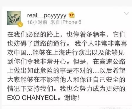 EXO的朴灿烈也曾在微博表示希望大家不要再有追车等一系列危险的行为