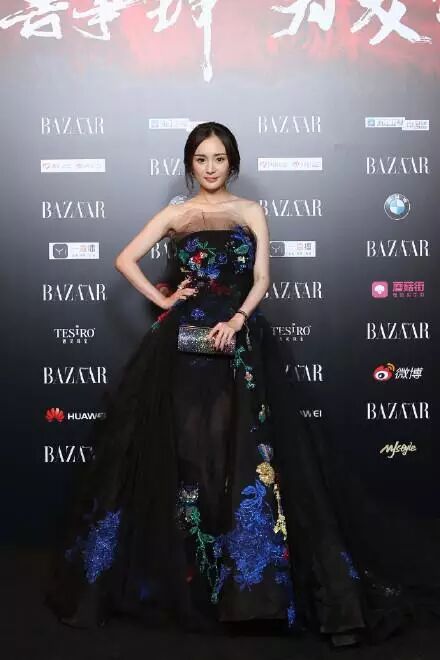 杨幂毫不费力的驾驭了这件WeCouture2016秋冬系列黑纱刺绣长裙,黑和蓝的底色衬托出她妈妈身份的沉稳气质,胸前和后背鹦鹉和花朵的刺绣带有活泼少女气质。少女辣妈名副其实。(珠宝CHAUMET、手包JIMMY CHOO、鞋子Giuseppe Zanotti Design)