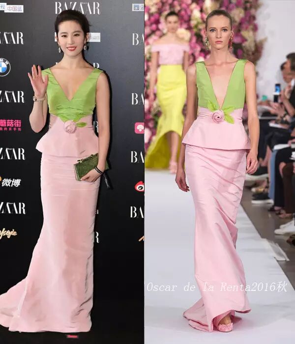Oscar de la Renta的粉绿礼服亮相的神仙姐姐刘亦菲让人眼前一亮。没想到白色清新系的神仙姐姐也可以如此的粉嫩。贴身的剪裁体现出了她的美好曲线,腰间的玫瑰更为她添加一抹俏皮。