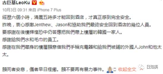 要感谢在后楼梯惶恐中仍答应把我们带上楼层的韩国一家人。感谢给我们水和毛巾的员工。感谢在我们藏身的楼层愿意借我们手机充电器和给我们被子的外国人John和他太太。愿死者安息,伤者早日痊愈。愿不要再有暴力事件。”