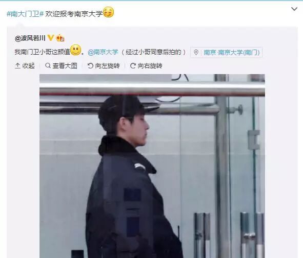 “颜值爆表!南大门卫小哥帅哭网友!”南京大学天文系本科生“@波风若川”在微博上分享了一组他拍的南大门卫小哥照片,南京大学官方微博特别转发,并配上了文字“欢迎报考南京大学”。