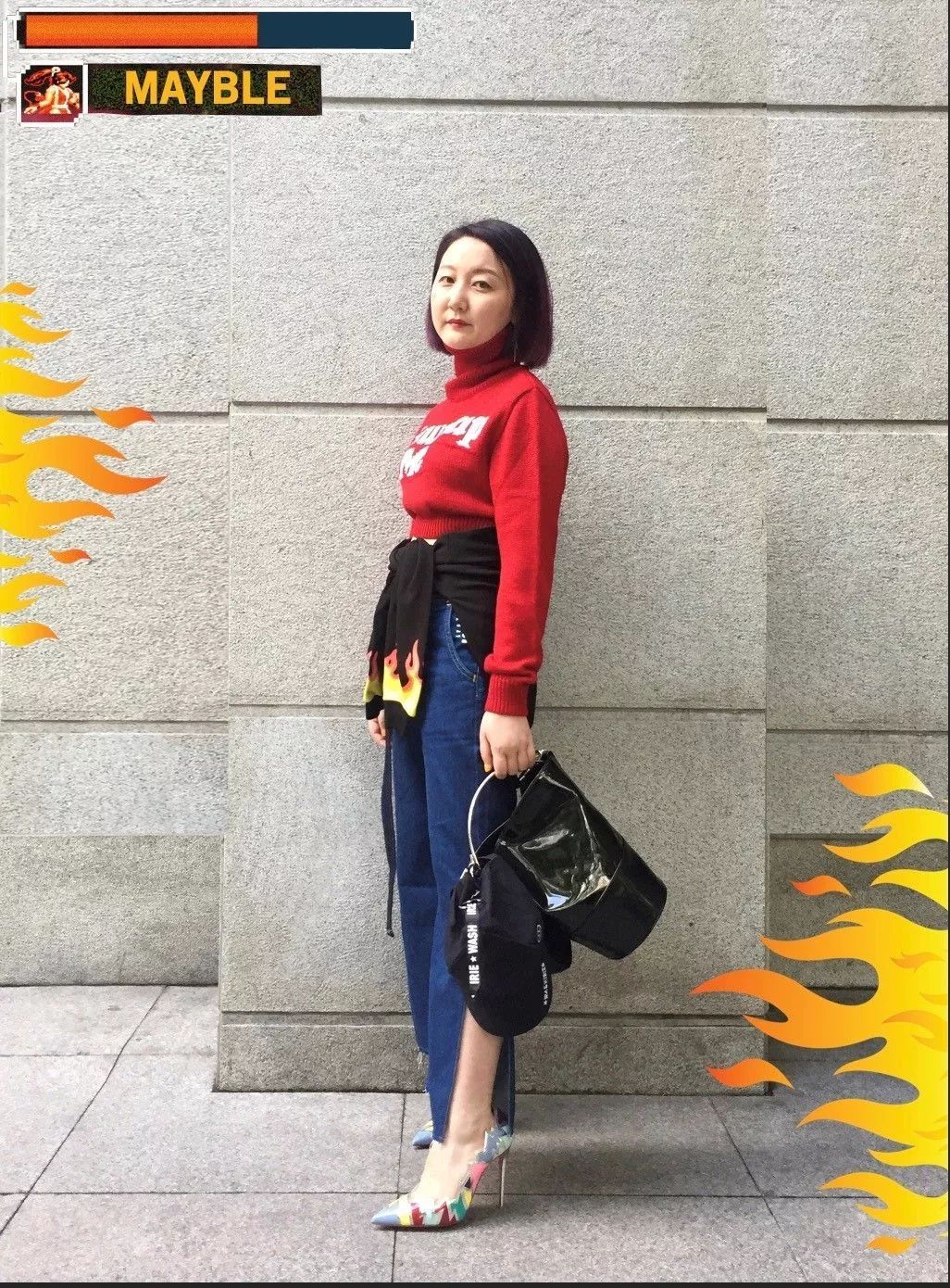 L:因为想让Mayble挑战一下她平时绝对不会穿的衣服,比如超短上衣。因为Mayble皮肤很白,所以红色会很衬肤色;大开叉的高腰牛仔裤比较接近她自己会穿的裤子,和红色针织衫搭在一起不会出错而且小复古。本来搭了一双绿色尖头丝绸平底鞋,一般人可能会觉得红配绿没法看,但其实小面积搭配是可以很时髦的,而且Mayble一定hold得住,可惜鞋子太小了最后没穿成:)