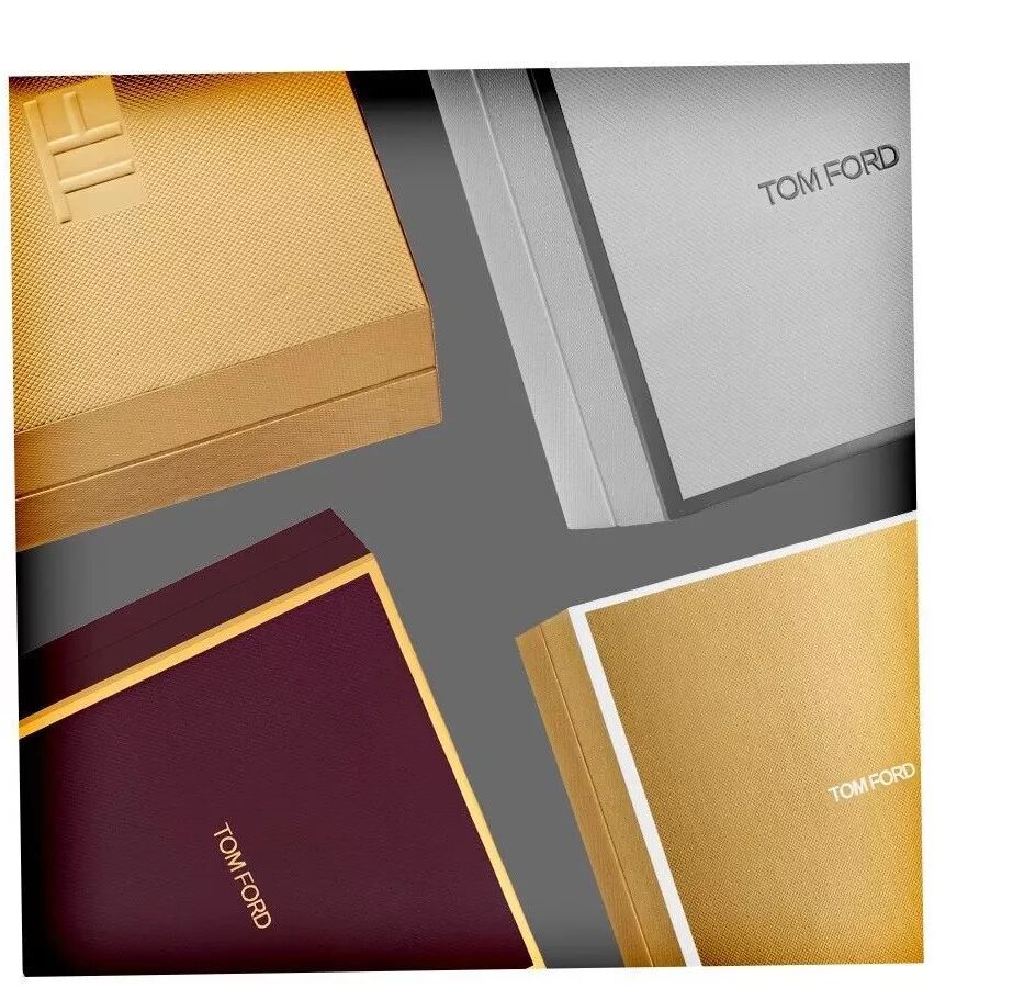 Tom Ford 假日礼盒并不屑大红大绿或花纹繁杂的圣诞元素,而是用更加凸显高级感的色彩来传递奢华浪漫的节日氛围:烫金边雅黑礼盒,灰度银边礼盒,光面金色礼盒……打开过程中手指划过颗粒感的包装纸,让整个拆的过程变得美妙。包装纸的封口是烫金的 TF Logo 贴纸,尽显细节和色彩的视觉冲击。