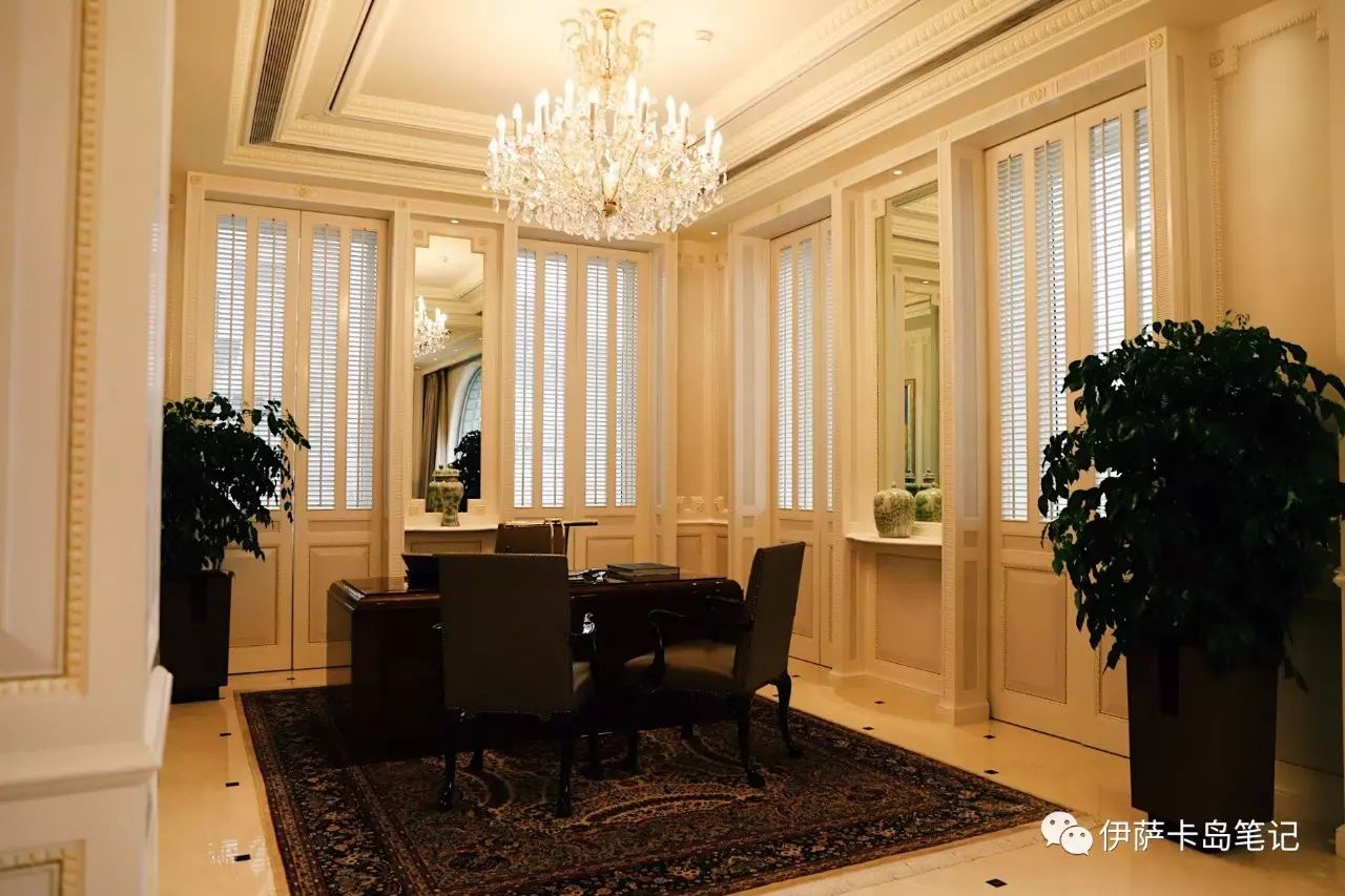 因为半岛套房有客人在住,所以这次我们参观的是马可孛罗套间,是半岛酒店最初的总统套房。房间里的布置是殖民古典风格,欧式的建筑框架里,有很多中式的摆设。以金色和白色为主,整体感觉奢华大气,还有种流金岁月的感觉。