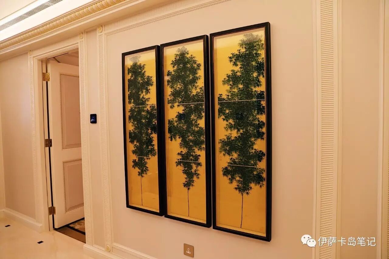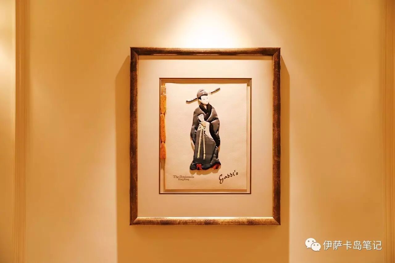 楼梯走下来又会看到墙上挂着的中国古代形象的挂画。这其实是半岛酒店里的法式餐厅吉地士的餐单封面,用传统的刺绣布艺制作的。现在用画框裱起来,既新颖,又古典。
