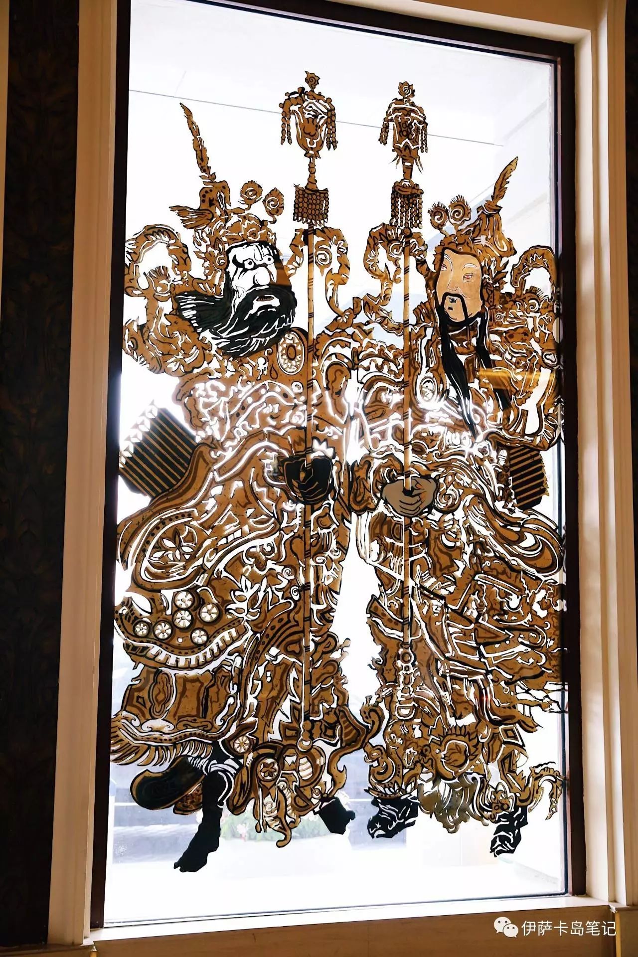 这就是酒店大门的平板玻璃上贴着的门神,大门前还有石狮子,根据中国传统习俗,用于保佑客人出入平安。