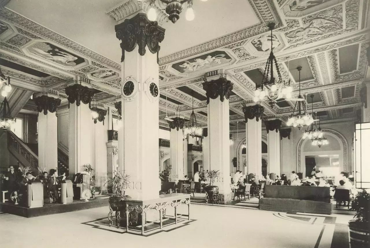 在近百年的岁月变迁里,香港半岛酒店的建筑也一直保持着原有的豪华,看1950年的大堂是这样的。