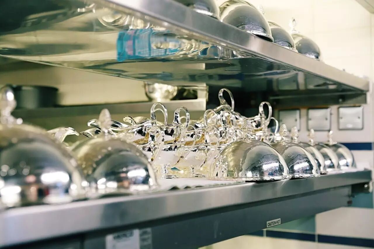 抬头就能看到旁边是吉地士餐厅干净整齐的后厨,架子上全是擦得锃亮的银器餐具,我们一行人个个都看得满眼发光。