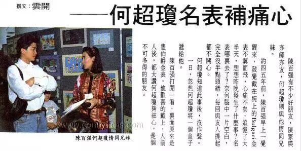 据说有一次陈百强不小心遗失了一块价值20多万港币的名表,心情非常不好,而何超琼知道后,立马就买了一块一模一样的送给他,不过陈百强却否认两人拍拖,他说自己的确很喜欢何超琼,但因为两人认识太久,太了解对方,所以反倒做不了情侣,最多算知己罢了。