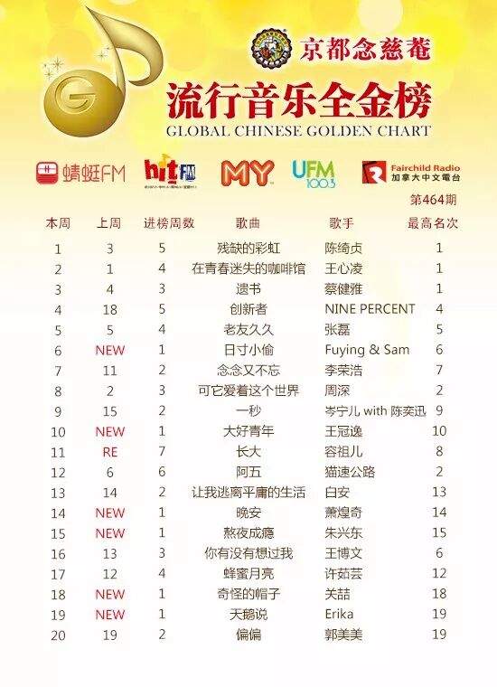 本期榜单中,陈绮贞新专辑首波主打《残缺的彩虹》、王心凌新作《在青春迷失的咖啡馆》、蔡健雅新专辑首波单曲《遗书》登上三甲之列。