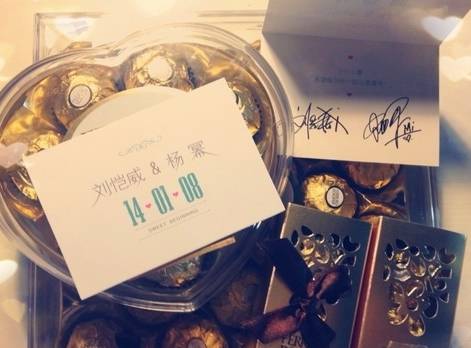 宣布婚礼之后,杨幂刘恺威开始给明星媒体们寄婚礼的喜糖和请柬,多数人收到的是费列罗巧克力礼盒,包装比较简单,巧克力的数量也有多有少。(好歹杨幂也算是四小花旦,这样的喜糖会不会太简单啦)