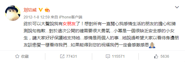 2012年1月18日,刘恺威在微博上宣布,“我有女朋友了”,从而正式公开和杨幂两人的恋情。