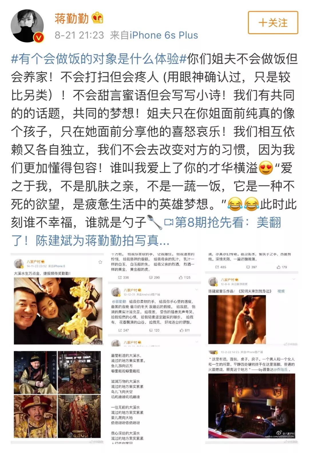 意思基本就是陈建斌不会做饭咋的了,我就是喜欢。蒋勤勤就像一个追星的少女,对自己老公满是崇拜。