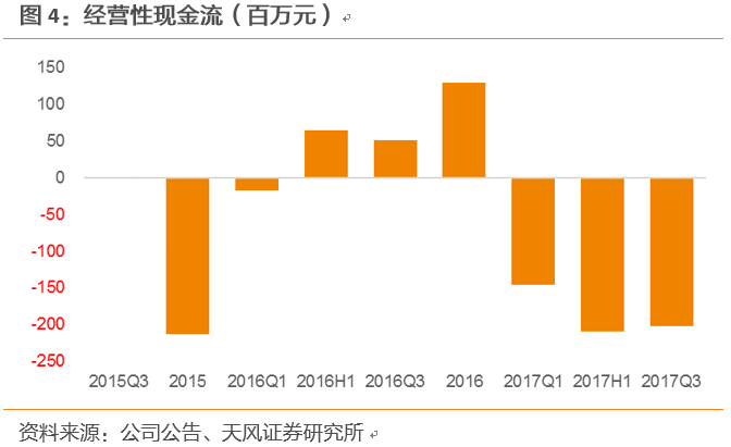 前三季度公司回款情况不佳,主因业务收款减少而支付供应商采购款增多。收现比同比减少41.29个百分点至79.53%;付现比同比增加9.73个百分点至138.73%;两者叠加致经营性现金流净额为-2.02亿元,较去年同期的-0.51亿元有所恶化。